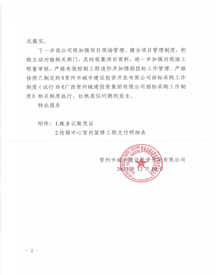 關(guān)于賀州傳媒中心綜合樓室內(nèi)裝修工程結(jié)算審計發(fā)現(xiàn)問題整改情況的報告